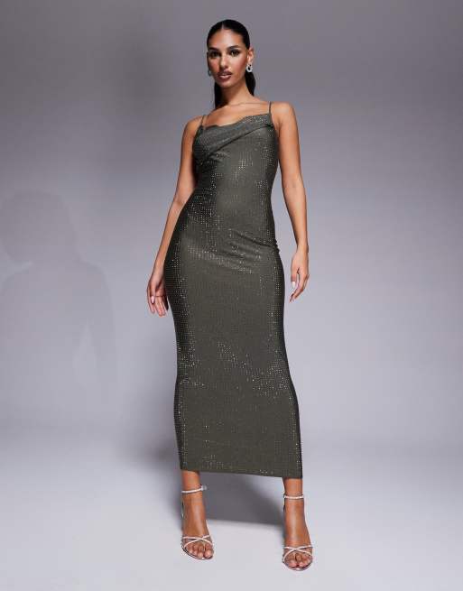 ASOS DESIGN – Szara modelująca sukienka midi z dżerseju z ćwiekami i odwiniętym elementem