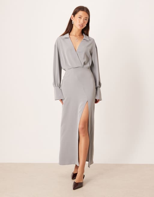ASOS DESIGN – Szara ołówkowa sukienka midi i koszulą z drapowaniem