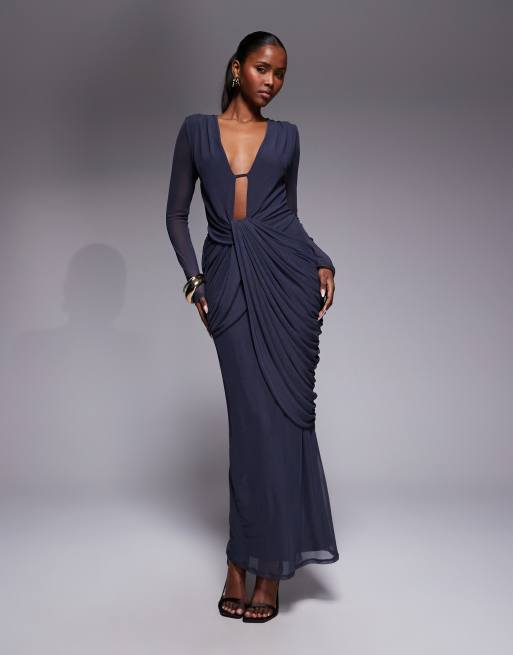 ASOS DESIGN – Szara siateczkowa sukienka midi z długimi rękawami, głębokim dekoltem i drapowaniem