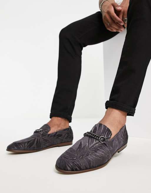 ASOS DESIGN – Szare aksamitne loafersy z łańcuszkiem i kontrastową podeszwą