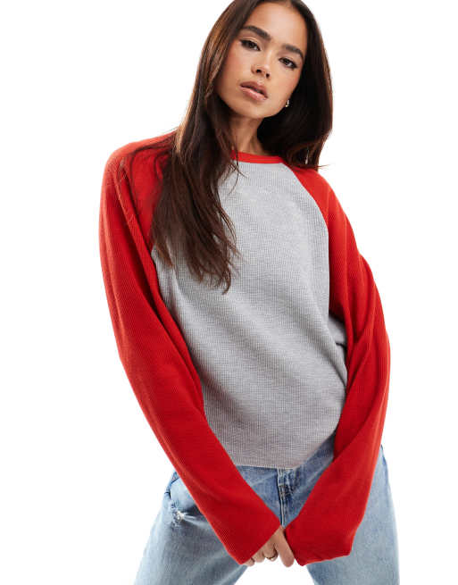 ASOS DESIGN – Szaro-czerwony top o waflowej fakturze z długimi raglanowymi rękawami