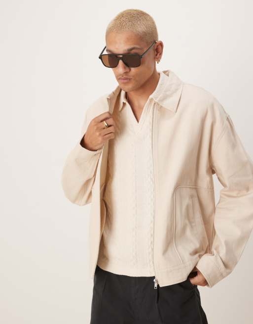 ASOS DESIGN – Szarobeżowa kurtka harrington o pudełkowym kroju z domieszką lnu premium
