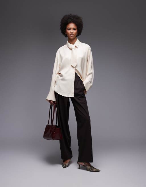 ASOS DESIGN – Szarobeżowa satynowa koszula oversize z krawatem