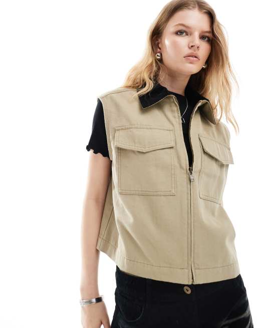 ASOS DESIGN – Szarobeżowy bezrękawniki z efektem sprania i sztruksowym kołnierzem