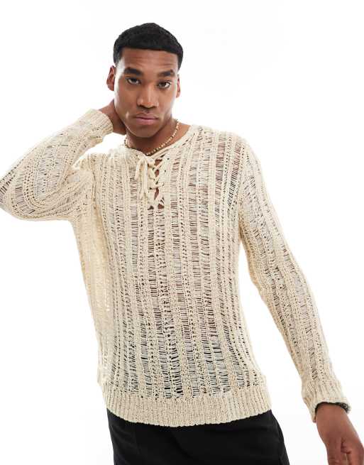 ASOS DESIGN – Szarobeżowy dzianinowy sweter z ażurowy splotem i ozdobnym sznurowaniem