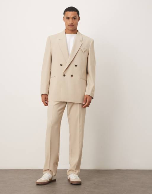 ASOS DESIGN – Szarobeżowy pudełkowy garnitur bez kołnierza z domieszką lnu