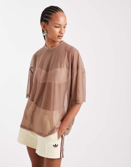 ASOS DESIGN – Szarobeżowy siateczkowy T-shirt oversize o wydłużonym fasonie