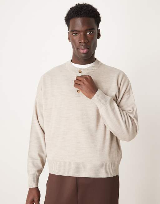 ASOS DESIGN – Szarobeżowy sweter dzianinowy o pudełkowym kroju oversize z dekoltem henley