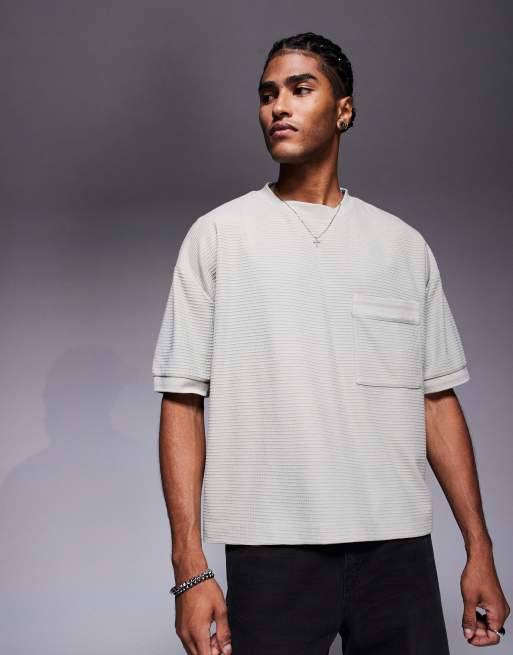 ASOS DESIGN – Szarobeżowy teksturowany T-shirt oversize o pudełkowym kroju z kieszenią