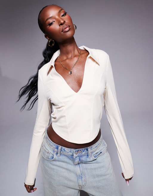 ASOS DESIGN – Szarobeżowy top z kołnierzykiem i długimi rękawami