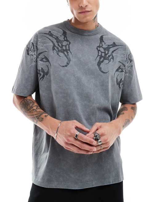 ASOS DESIGN – Szary T-shirt oversize z nadrukiem w stylu grunge na ramionach i efektem sprania