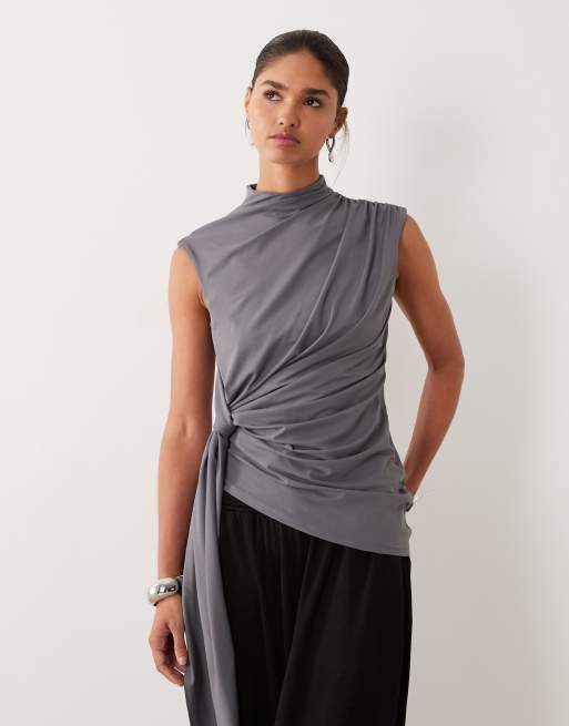 ASOS DESIGN – Szary top bez rękawów z zabudowanym dekoltem i wiązaniem