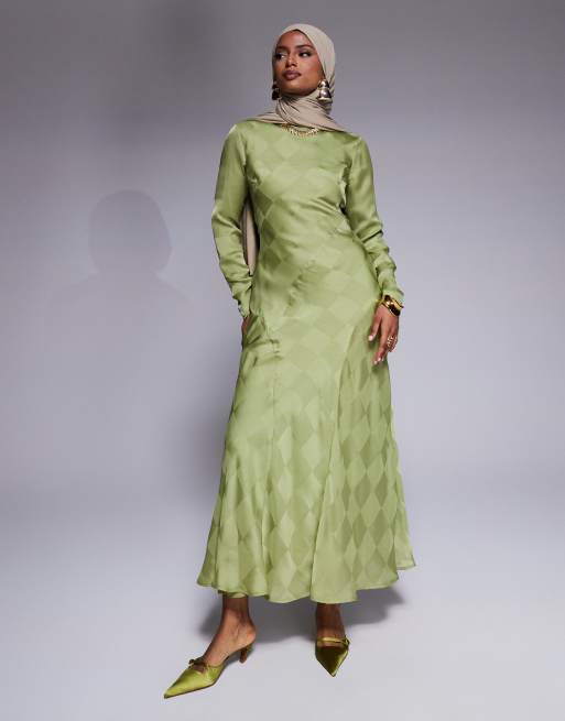 ASOS DESIGN – Szałwiowa satynowa sukienka maxi z zabudowanym dekoltem i wzorem w szachownicę