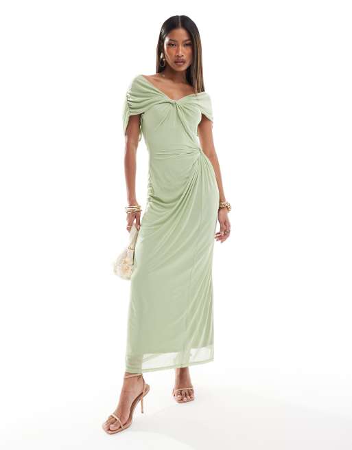 ASOS DESIGN – Szałwiowa siateczkowa sukienki midi z odkrytymi ramionami i skręconym przodem