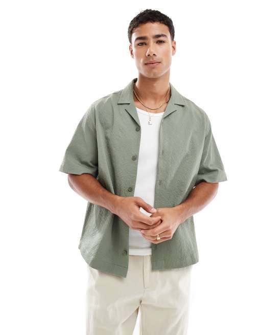 ASOS DESIGN – Szałwiowozielona koszula z kory o pudełkowym kroju z kołnierzykiem kubańskim