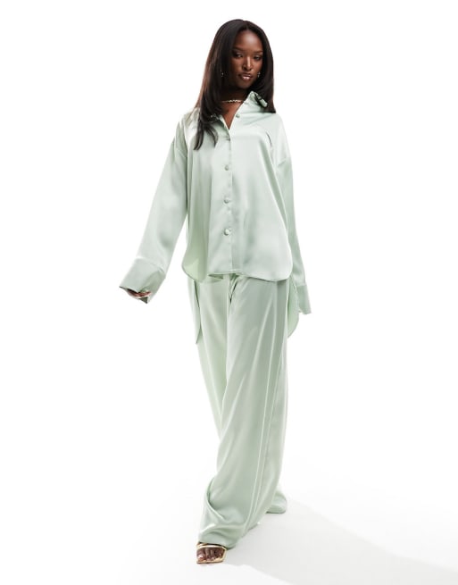 ASOS DESIGN – Szałwiowozielona satynowa piżama: spodnie z szerokimi nogawkami i koszula