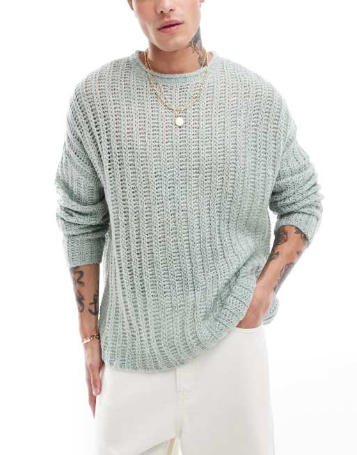 ASOS DESIGN – Szczotkowany prążkowany sweter oversize z dzianiny z ażurowym ściegiem w zielonym kolorze