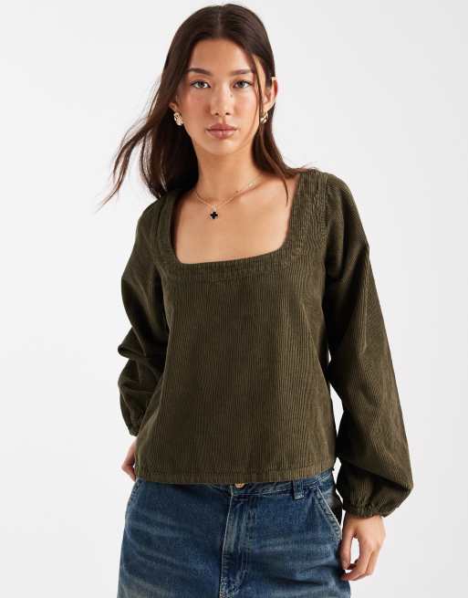 ASOS DESIGN – Sztruksowy top w stylu babydoll z długimi rękawami w kolorze khaki