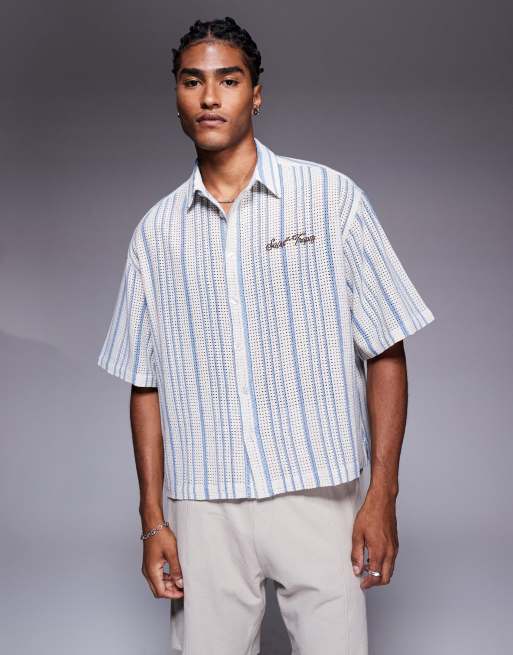 ASOS DESIGN – Szydełkowa koszula o pudełkowym kroju oversize w kolorze niebieskim i ecru z haftem na piersi