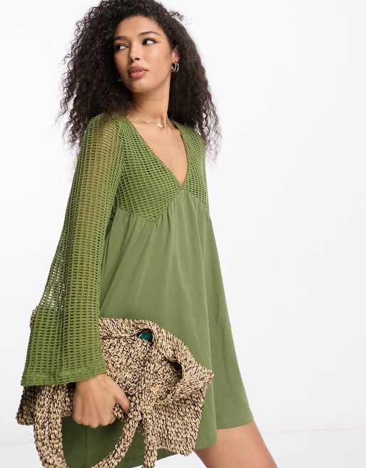 ASOS DESIGN – Szydełkowa sukienka mini w kolorze khaki, z długimi rękawami