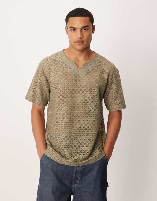 ASOS DESIGN – Szydełkowy luźny T-shirt z wcięciem przy dekolcie w kolorze khaki