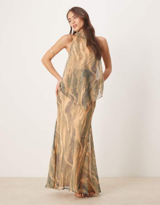ASOS DESIGN – Szyfonowa dwuwarstwowa sukienka maxi w marmurkowy wzór z zabudowanym dekoltem