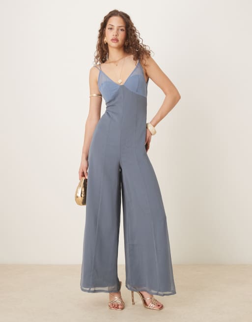 ASOS DESIGN – Szyfonowy kombinezon z prześwitującą wstawką i dekoltem w szpic w dwóch odcieniach niebieskiego