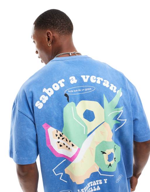 ASOS DESIGN – T-shirt oversize o gramaturze 220 gsm, w spranym kolorze niebieskim, z nadrukiem