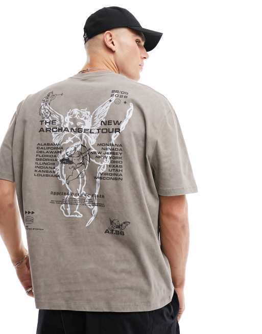 ASOS DESIGN – T-shirt oversize w spranym brązowym kolorze z nadrukiem anioła na plecach