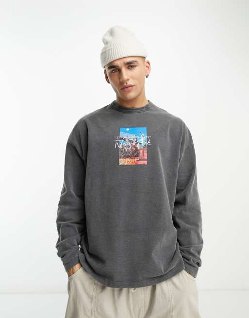 ASOS DESIGN – T-shirt oversize z nadrukiem na plecach i długim rękawem w spranym czarnym kolorze