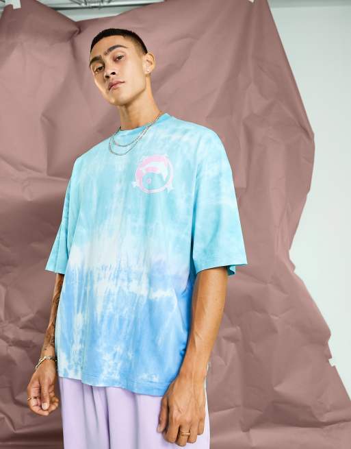 ASOS DESIGN – T-shirt oversize z niebieskim efektem tie dye i nadrukiem na klatce piersiowej