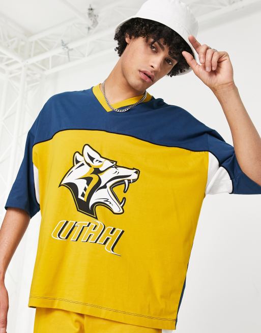 ASOS DESIGN – T-shirt oversize z żółto-granatowymi blokami kolorów, dekoltem w szpic i nadrukiem miasta Utah, część zestawu
