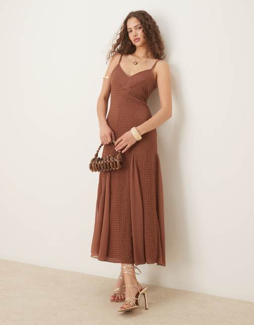 ASOS DESIGN – Teksturowana czekoladowa sukienka midi na ramiączkach z ozdobnymi szwami i godetami