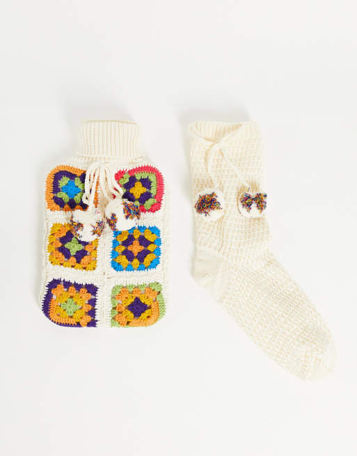 ASOS DESIGN – Termofor i skarpetki z kolorowym szydełkowanym wzorem i pomponami