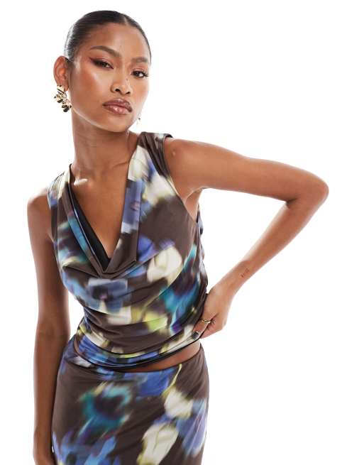 ASOS DESIGN – Top bez pleców z drapowanym dekoltem w rozmyty kwiatowy wzór
