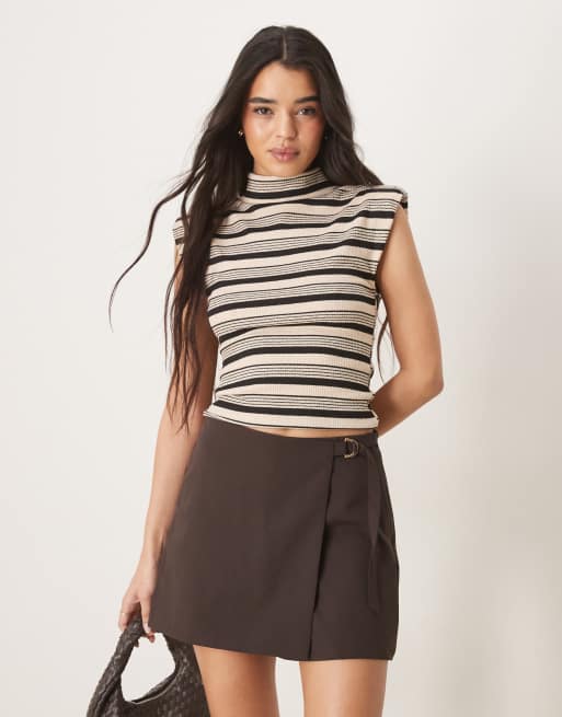 ASOS DESIGN – Top bez rękawów z poduszkami na ramionach i zabudowanym dekoltem w camelowo-czarne paski