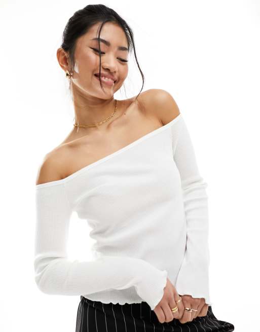 ASOS DESIGN – Top o waflowej teksturze z dekoltem bardot w kolorze kości słoniowej