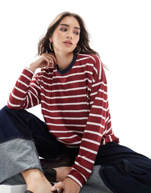 ASOS DESIGN – Top w paski o pudełkowym kroju z długimi szerokimi rękawami i czerwoną lamówką