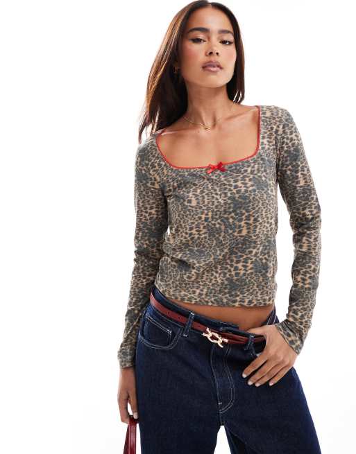 ASOS DESIGN – Top z długim rękawem w panterkę z kontrastowym wykończeniem