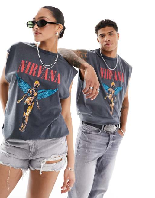 ASOS DESIGN Unisex – Czarny podkoszulek oversize z efektem sprania i grafiką z licencjonowanym motywem zespołu Nirvana