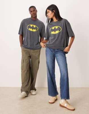 ASOS DESIGN Unisex – Czarny T-shirt oversize z logo z motywem Batmana i efektem sprania