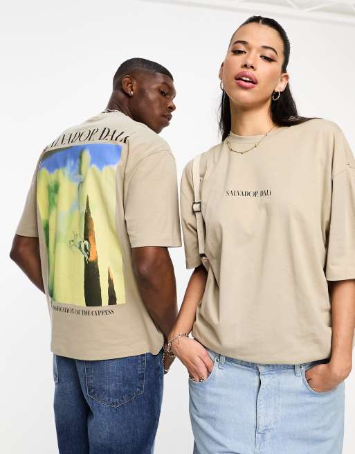ASOS DESIGN Unisex – Szarobeżowy T-shirt oversize z licencjonowanym nadrukiem obrazu Salvadora Dali