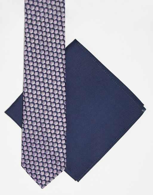 ASOS DESIGN – Wąski granatowy krawat w różowy geometryczny wzór i granatowa poszetka