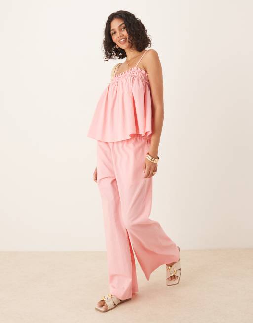 ASOS DESIGN Wciągane różowe spodnie z marszczoną talią, część zestawu