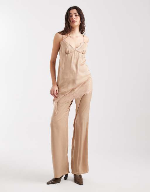 ASOS DESIGN – Wciągane spodnie z szerokimi nogawkami z gniecionej satyny w beżowym kolorze
