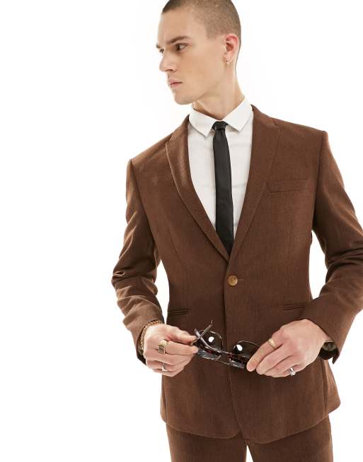 ASOS DESIGN Wedding – Brązowa dopasowana marynarka garniturowa z mieszanki wełny o koszykowym splocie