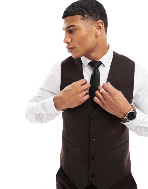 ASOS DESIGN Wedding – Ciemnobrązowa dopasowana kamizelka garniturowa z mieszanki wełny o koszykowym splocie