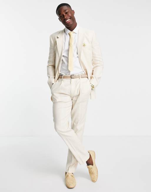 ASOS DESIGN Wedding – Kamiennobeżowa dopasowana marynarka garniturowa z mieszaki lnu w szerokie paski