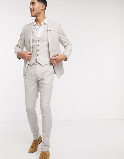ASOS DESIGN Wedding – Kamiennobeżowy garnitur o bardzo obcisłym kroju z domieszką lnu