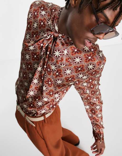 ASOS DESIGN – Wiązana pod szyją satynowa koszula w stylu lat 70. w kafelkowy wzór